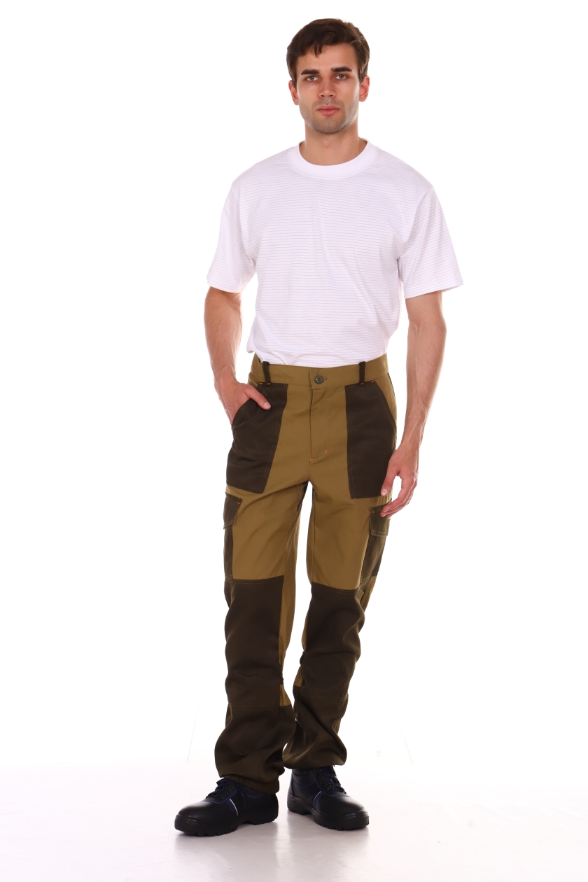 ➠ Брюки с цельнокроеным поясом, застегиваются на петлю и пуговицу. На верхних частях передних половинок расположены верхние накладные карманы и нижние накладные карманы с фигурными клапанами на пуговицах. Нижние карманы с объемом с одной стороны и переходят на задние половинки.