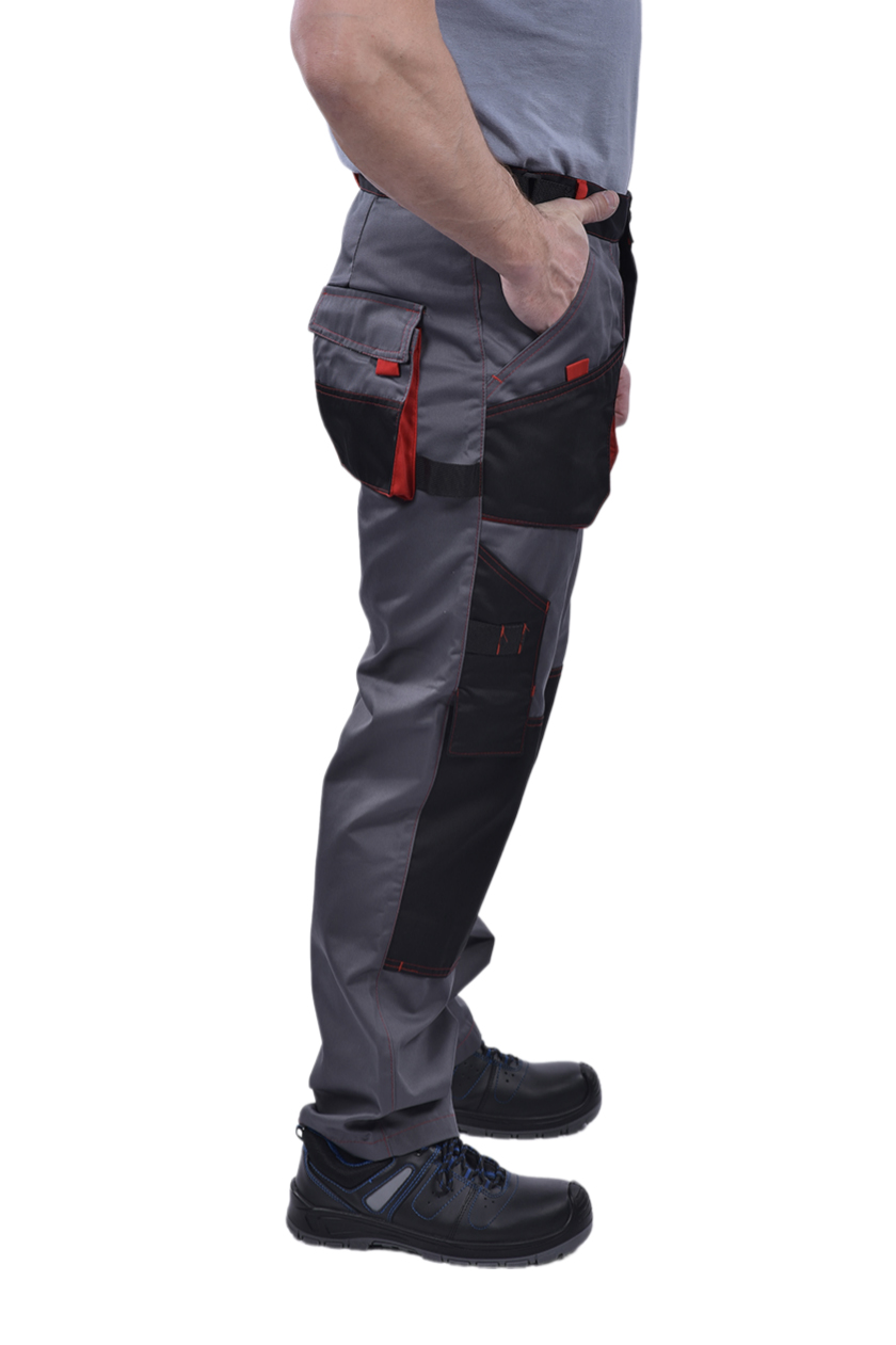 Брюки мужские с застежкой гульфика на тесьму «молния» и притачным поясом с красными шлевками. Передние половинки брюк с 2 боковыми накладными карманами с наклонным входом. На левой половинке в области колена дополнительный карман.